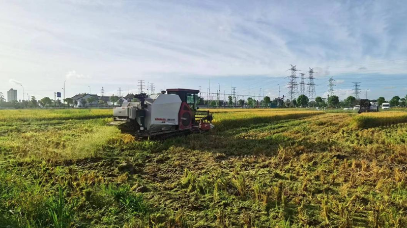 走進臺州市椒江區(qū)洪家場浦綠廊示范區(qū),處處彌漫著稻谷的清香。沉甸甸的水稻彎下了腰,微風(fēng)吹過,一陣陣稻海輕輕搖動,泛起了層層波浪;田間收割機來回穿梭,將粒粒飽滿的水稻盡數(shù)收入“囊中”。這是由浙農(nóng)科技承接運營的椒江區(qū)洪家街道等四個街道全域土地綜合整治項目一期示范區(qū)內(nèi)的豐收景象。